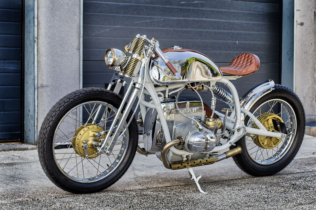 Una combinación de cuero marrón, pintura en polvo blanca y autobuses cromados y chapados en latón antiguo añaden un toque de color a esta impresionante BMW con horquillas de ballesta.